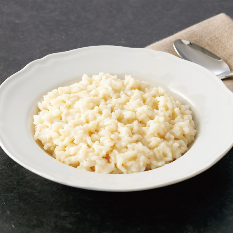 カルナローリ米(イタリア産)、米粉(イタリア産、ルーマニア産)、ホエイ、粉チーズ、食塩、オリーブオイル、グルコースシロップ、ミルクプロテイン、たまねぎ、全粉乳、にんにく/香料(一部に乳成分を含む)