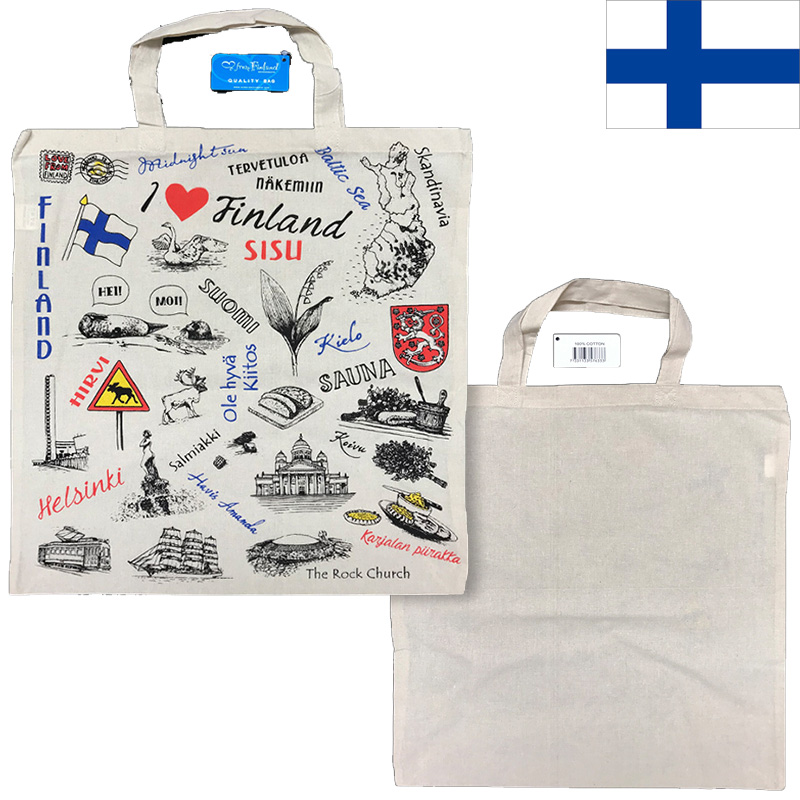 国旗・白鳥・トラム・トナカイ・サウナなどなど、フィンランドを象徴するアイテムが描かれたかわいいエコバッグです。