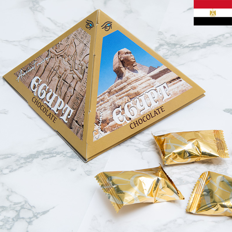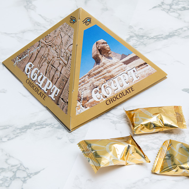 スフィンクスやツタンカーメンなど、エジプトのモチーフを描いたピラミッド型のパッケージが魅力的!