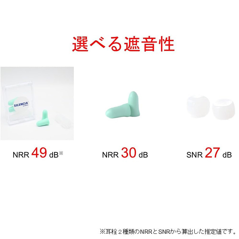 ポリウレタン耳栓とシリコン耳栓を併用することにより、遮音値NRR49dBを実現しました。