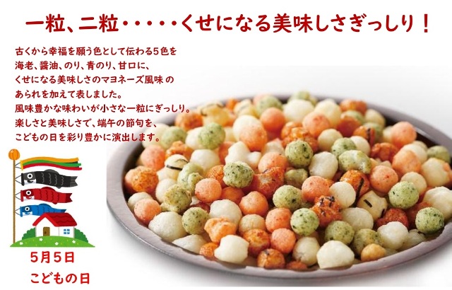 彩り豊かな五色のあられ入りの太郎鯉で、端午の節句に彩りを添えてはいかがでしょうか。古くから幸福を願う色として伝わる5色を「海老」「醤油」「のり」「青のり」「甘口」に、くせになる美味しさのマヨネーズ風味のあられを加えて表しました。