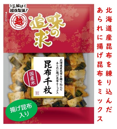 北海道産昆布を練り込んだあられにパリパリに揚げた昆布をミックスしました。