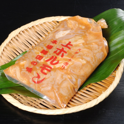 | 自家製みそダレで仕上げた当店自慢の味付けホルモンです。豚直腸を中心にやわらかいホルモンだけを使って食べ易い大きさに切って提供いたしております。 ぷりぷりした食感がたまらない美味しさをお楽しみください。 我が家では、子供もこのプリプリホルモンは、お気に入りです。 食べやすい上に、みそダレとの相性も良いみたいで、食卓に並ぶと すぐに取り合いが始まるくらいです。 それに野菜を入れると、ホルモンがすごく美味しくなります。 特に、キャベツ、にら、玉ねぎ、もやし等は、絶対にはずせないですよ。 それぐらい、このホルモンには良く合います。 きっと、自家製味噌ダレがホルモンにも野菜にも、ピッタリなんだと思います。 なにせ、店主が、約1年間かかりっきりで仕上げた、汗と努力の結晶ですから・・・(^・^) 焼き方は、フライパンにあけて、野菜をたっぷり入れて、最初は強火で焼き上げてください。 ホルモンにも、野菜にも程よく火が通ったと思ったら、中火にしてしばらくことこと 焼いてください。そうすると、次第に水分が無くなり、たれが具材に良く浸み込んで 美味しく食べることが出来ます。 また、途中でうどんやご飯を入れて、一緒に焼いてみるのも、美味しい食べ方ですよ。 一度、試してみてください。後悔させません!! と・いうことで、是非、当店自慢のホルモンを食べてみてください。