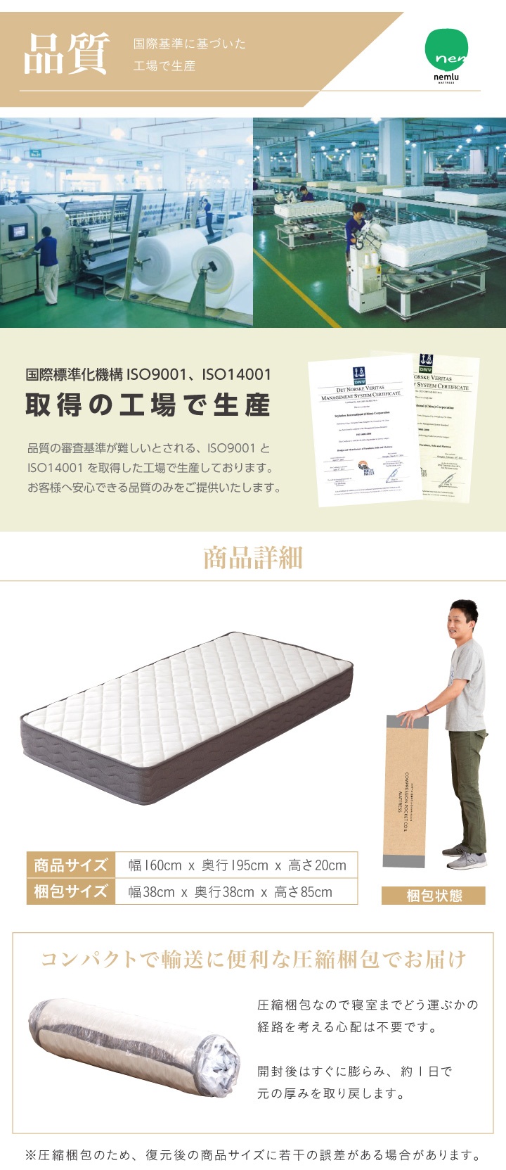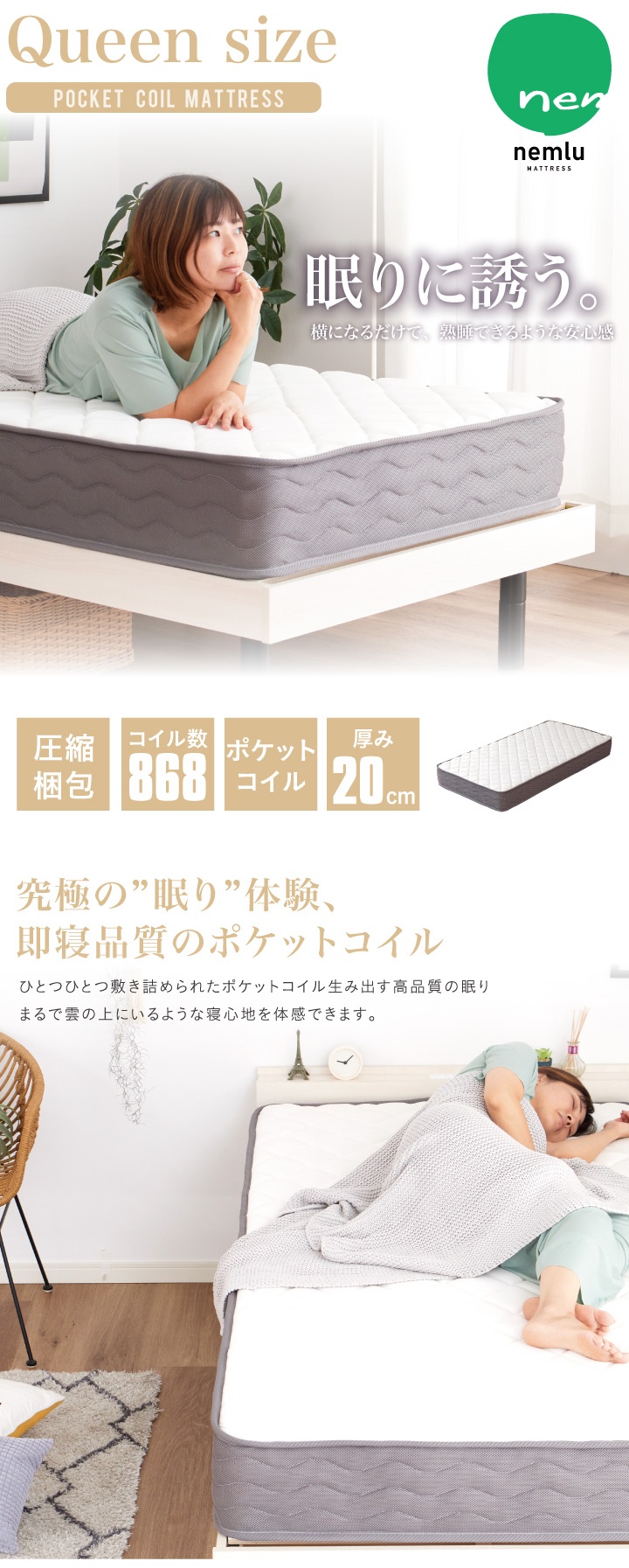 ポケットコイル マットレス クイーン コイル数 868個 厚み20cm 真空圧縮 コンパクト梱包 ふっくら 柔らか 柔め / 頑丈 人気 安い 寝具 クイーンベッド用 送料無料 sanjp-0333
