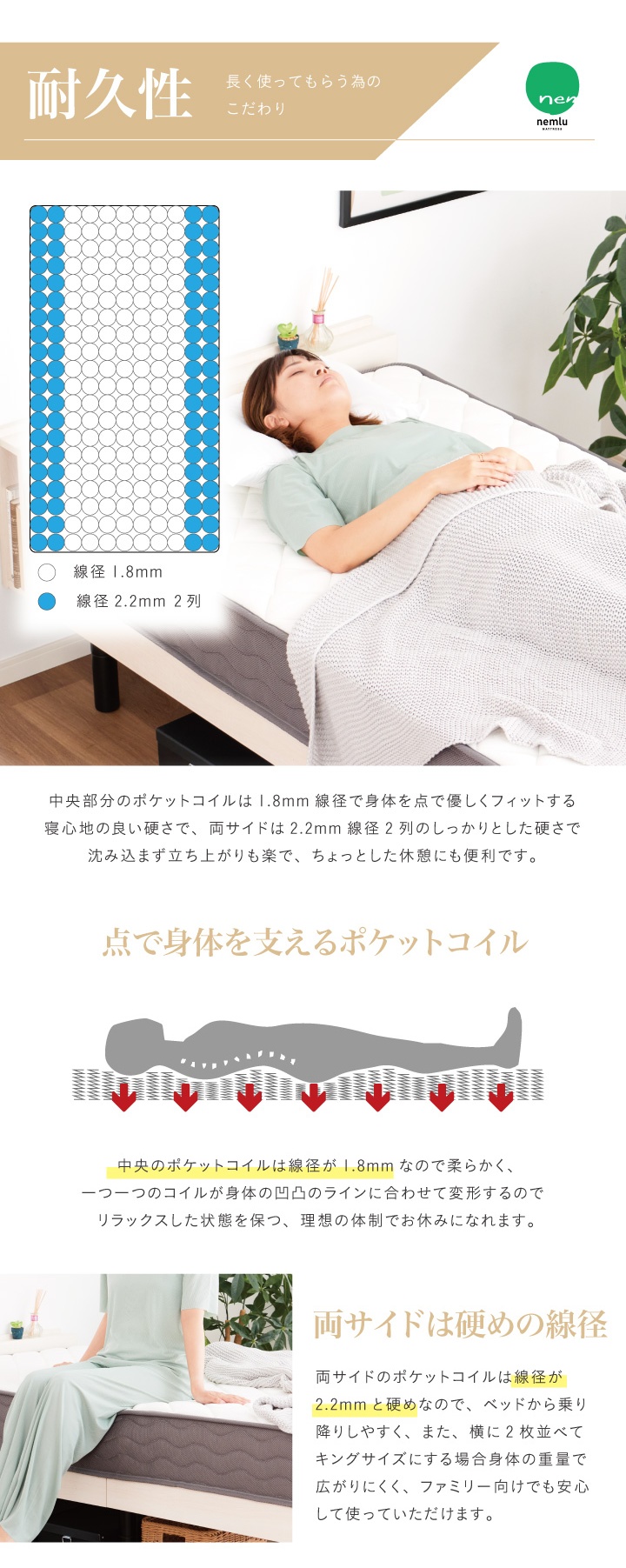 本体:ポケットコイルスプリング(線径1.8mmH180mm+サイド2列線径2.2mm)