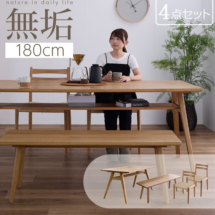 ダイニングテーブル テーブル 4点セット 180幅 天然木 肘なし ベンチ オーク 無垢材 収納棚付き 棚付き / 長方形 無垢材 北欧 シンプル モダン 4人 180 ダイニング テーブル おしゃれ ナチュラル 木製 無垢 食卓テーブル 北欧 通販