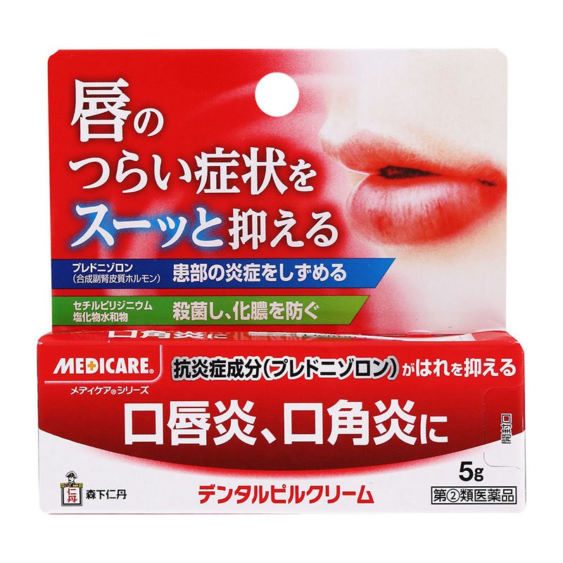 ◆デンタルピルクリームは、抗炎症作用のある合成副腎皮質ホルモン・プレドニゾロンと、細菌感染を防ぐ殺菌成分・セチルピリジニウム塩化物水和物を効果的に配合しており、口唇炎、口角炎などに優れた効果をあらわします。
