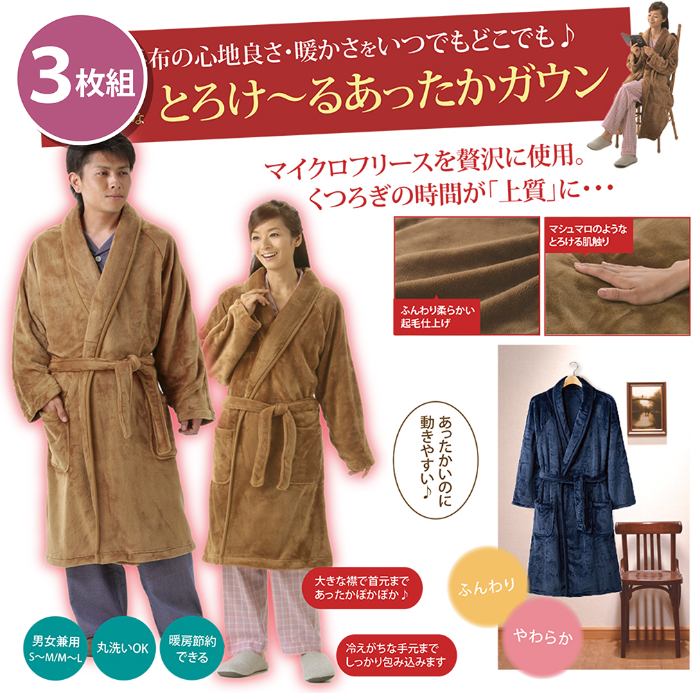 まとめ買い ネイビー S~M 3枚 毛布のようなとろけ~るあったかガウン ルームウェア パジャマ ガウン 毛布 レディース メンズ 男女兼用 Eclea 爆売 爆買