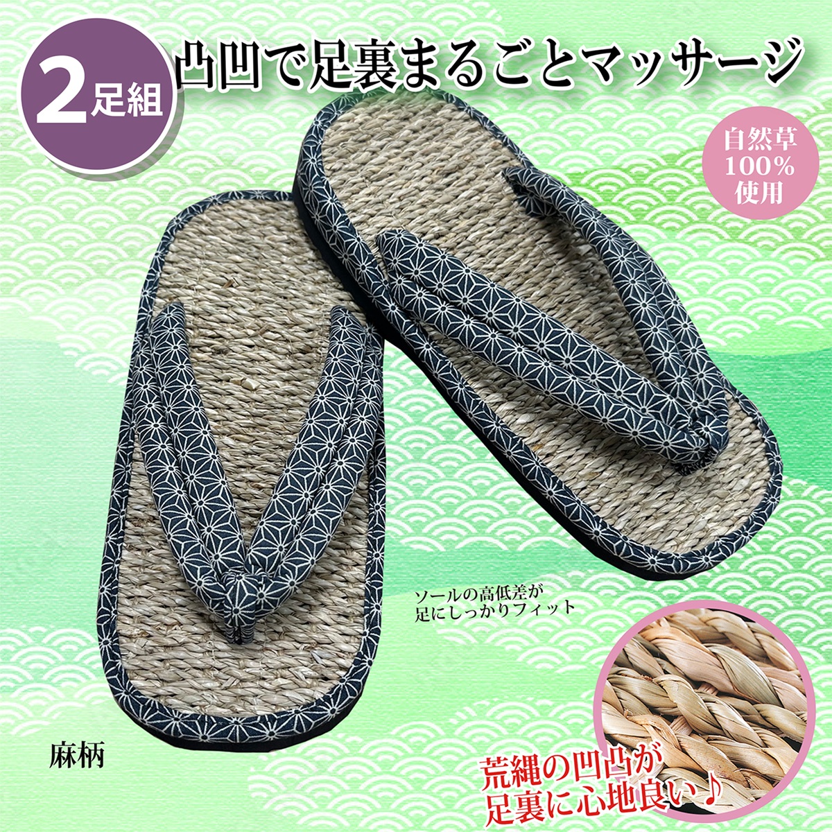 足裏に接触する面が縄織りの凸凹になっているため、通気性に優れ、足ムレせず、べたつき感もなく快適な履き心地。