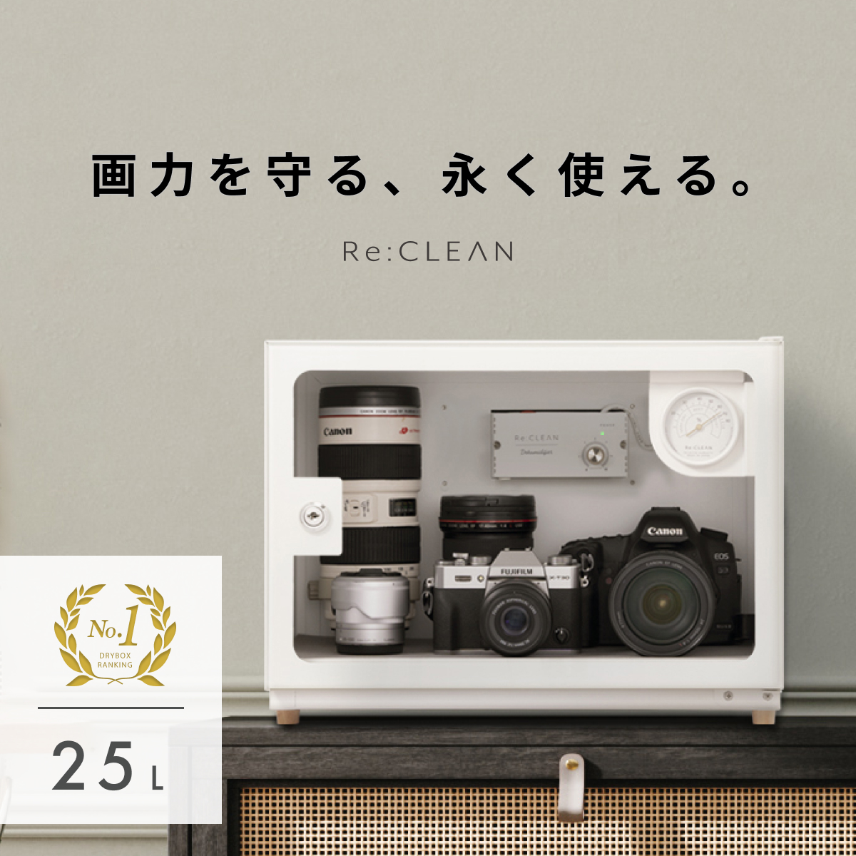 【ライト充電機能付き】Re:CLEAN 防湿庫 25L RC-25L 日本製ペルチェ採用 ホワイト ドライボックス アナログ湿度計 カビ対策 デジタル湿度計 カード トレカ