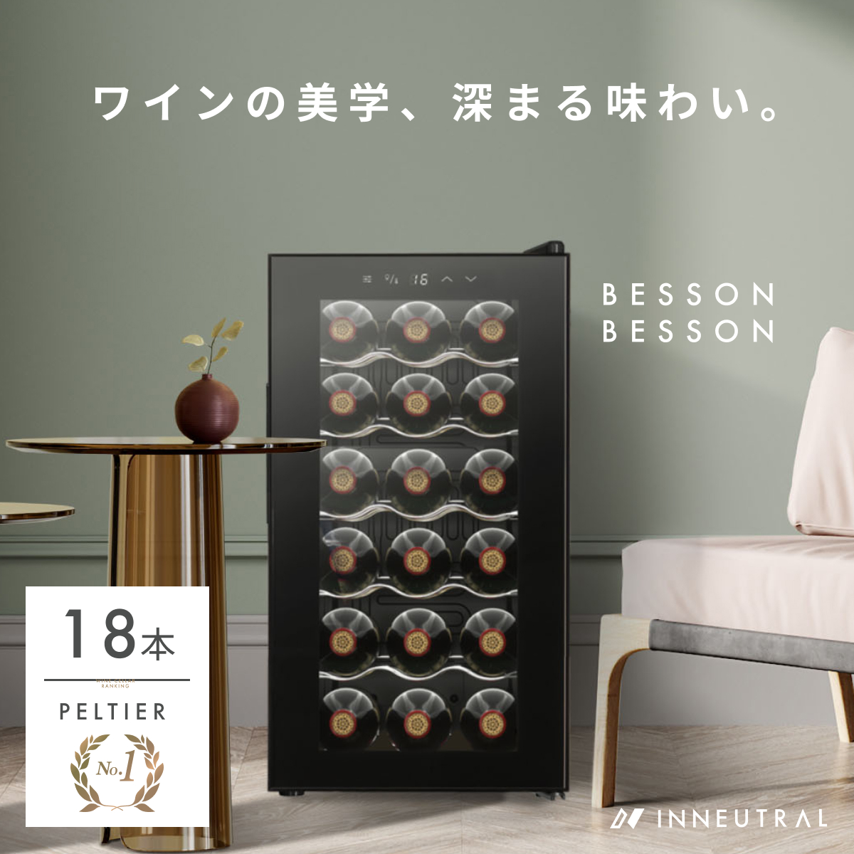 Besson ワインセラー 18本収納 小型 日本製ペルチェ採用 家庭用 縦置き スリム ペルチェ式 【安定冷却+静音設計】LEDライト搭載