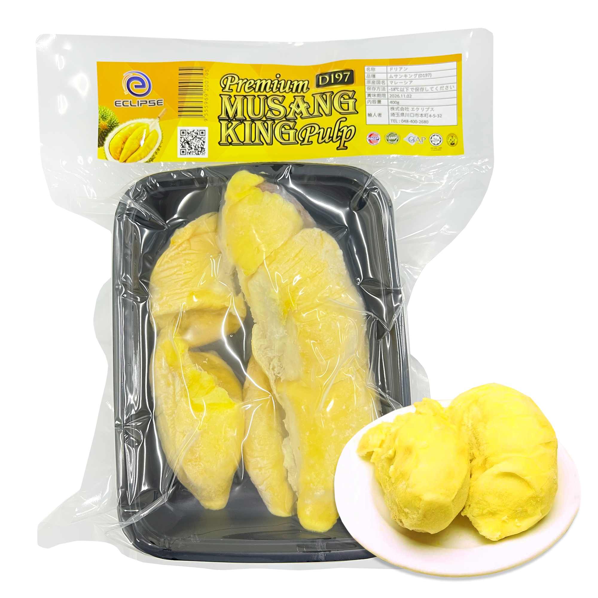 冷凍ドリアン マレーシア産 「ムサンキング(D197)種」 400g/袋 さわやかな南南西の風とまぶしい太陽が、肥沃なマレーシアの大地に特上のドリアンを育てました。 現地の名人が厳選した完熟の一番美味しいところを急速冷凍しました。 「果物の王様」と呼ばれるにふさわしいトゲ(ドリ)の外皮に守られた果肉は麝香の香りと濃厚な味覚。 数ある品種の中でも、香りがきつくなく、甘みにコクのある「ムサンキング(D197)種」だけを厳選しました。 脂質、タンパク質、ミネラル(カリウム、マグネシウム、リン、亜鉛,銅)、ビタミンBを多く含みます。 カロリーはアボガドと同等です。 保存上の注意 冷凍のみご利用ください。開封後はお早めにお召し上がりください。 解凍方法 召し上がり方にもよりますが、冷蔵庫内解凍で2時間程度。 常温解凍は、ドリップが流出するため風味と栄養素を損なう可能性があります。 食べる量だけを冷凍庫から冷蔵庫に移して解凍してください。