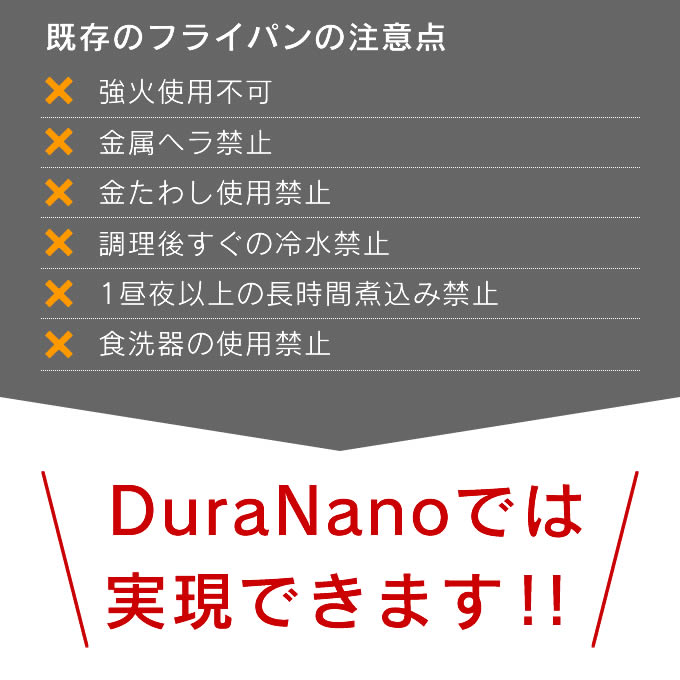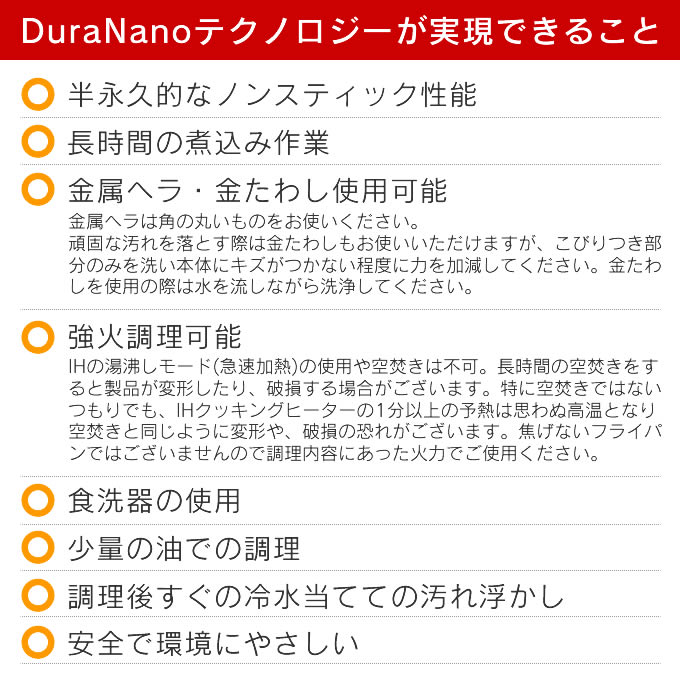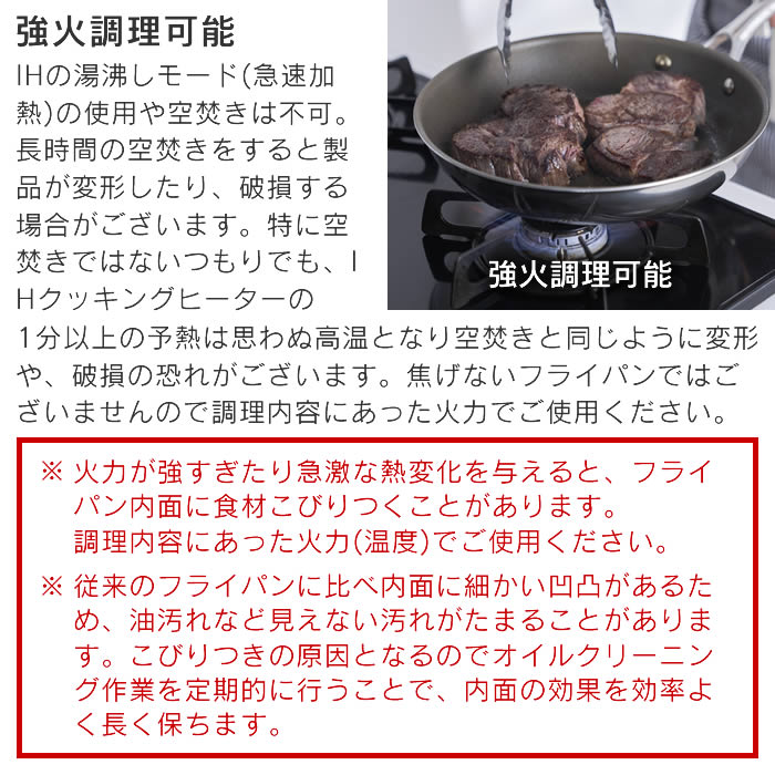 | ・火力が強すぎたり急激な熱変化を与えると、フライパン内面に食材こびりつくことがあります。調理内容にあった火力(温度)でご使用ください。 ・従来のフライパンに比べ内面に細かい凹凸があるため、油汚れなど見えない汚れがたまることがあります。こびりつきの原因となるのでオイルクリーニング作業を定期的に行うことで、内面の効果を効率よく長く保ちます。 |