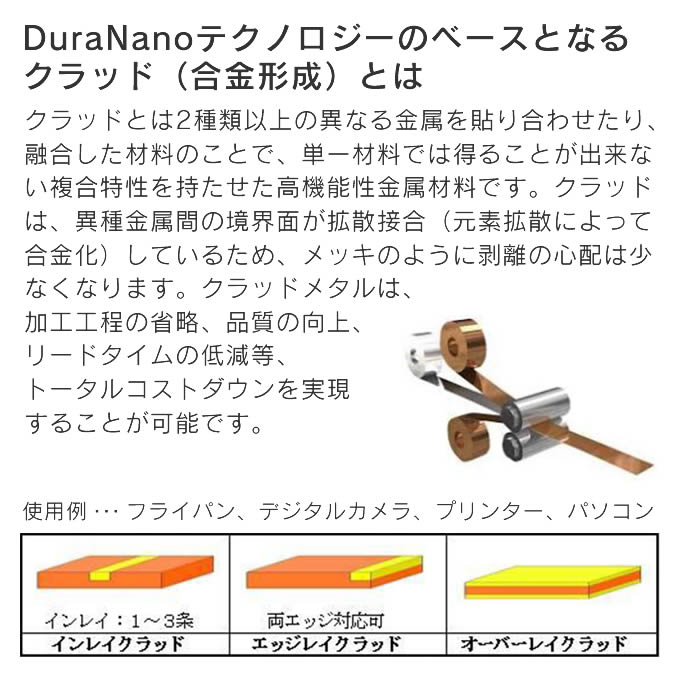 | コレール、ずっとあなたの食卓に、生涯よりそうフライパン ベースのステンレス鋼にチタン・ジルコニウム・セラミック粉末などを超高温加工するナノテクノロジーで半永久的なこびりつきにくさを実現 樹脂未使用なので、強火調理可能 通常の鉄に比べて、およそ4倍の硬度を実現 |