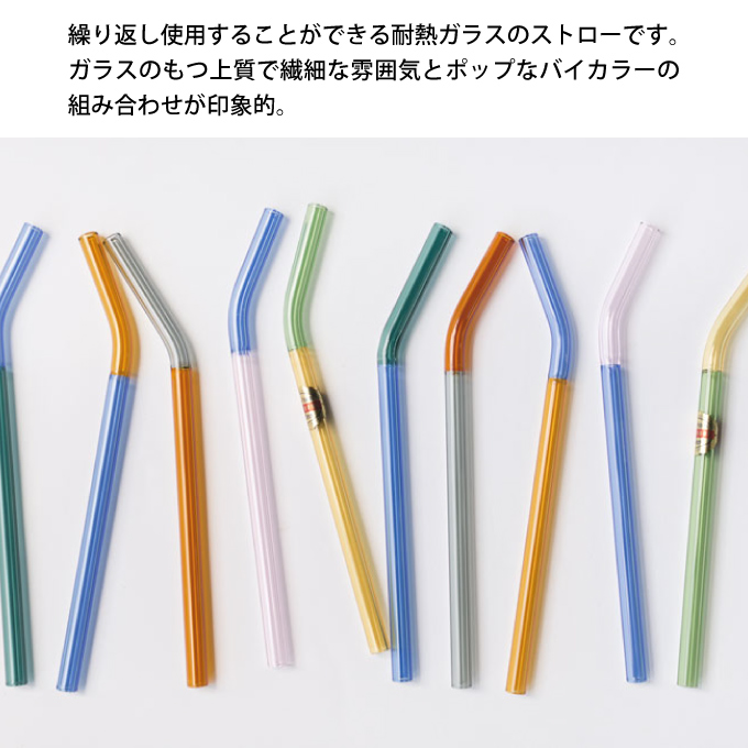 | 繰り返し使用することができる耐熱ガラスのストローです。ガラスのもつ上質で繊細な雰囲気とポップなバイカラーの組み合わせが印象的。 |