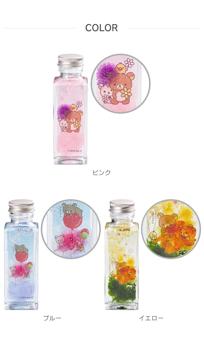 リラックマのキャラが瓶に写るハーバリウムアレンジです。