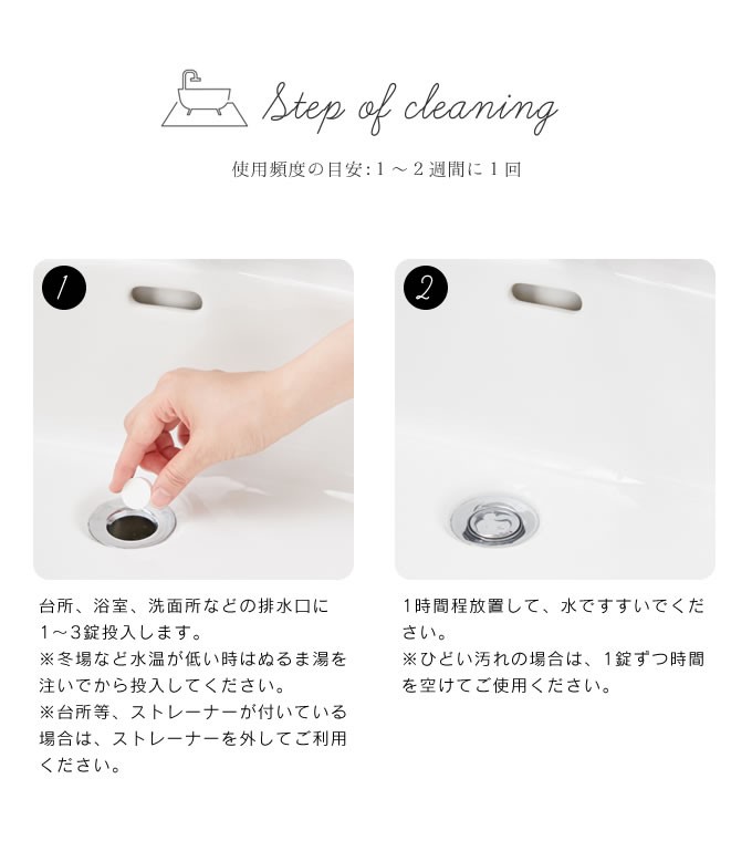 用途:台所・洗面台、浴槽の排水口の洗浄 1回の使用量目安:1〜3錠 使用できないもの:銅、真鍮、鋳鉄、アルミニウム、木、ゴム製のもの |