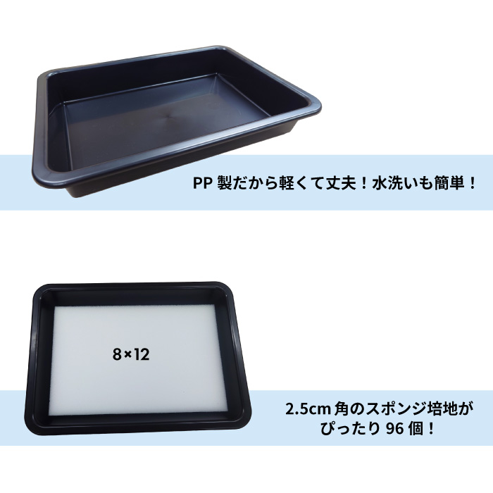 | 水耕栽培の種まきにぴったりのトレイです。PP製だから軽くて丈夫!水洗いも簡単にできます。2.5cm角のスポンジ培地なら96個がぴったり入ります。使わない時は重ねて収納できます。 |