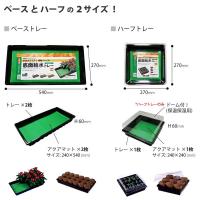 | 使用方法 | 1、トレーに底面給水マットを敷き、水を注ぎます。 2、余分な水分を捨て育苗・育成するポット等を底面給水マットの上にならべます。 3、底面給水マットが乾いたら水やりをしましょう。※過湿にならないように注意します。 *ドームはハーフトレーのみに付属しています。温度や湿度が必要な時、適宜にご使用ください。 |
