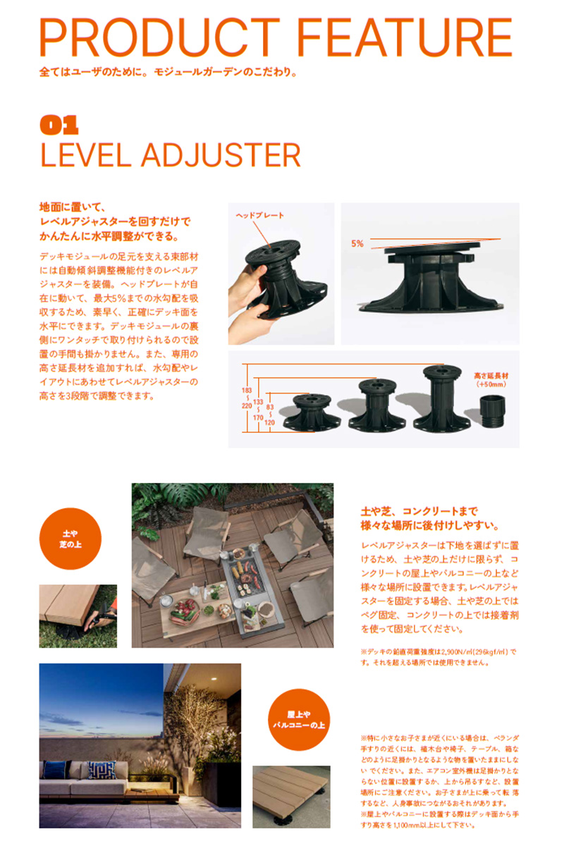 デッキモジュールの足元には自動傾斜調整機能付きのレベルアジャスターを採用。