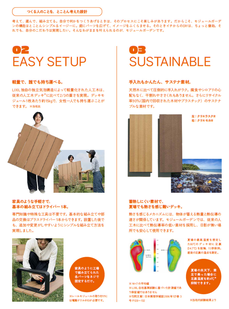 モジュールガーデンでは、従来の人工木に比べて熱伝導率の低い素材を採用し、日影が無い場所でも安心して使用できます。