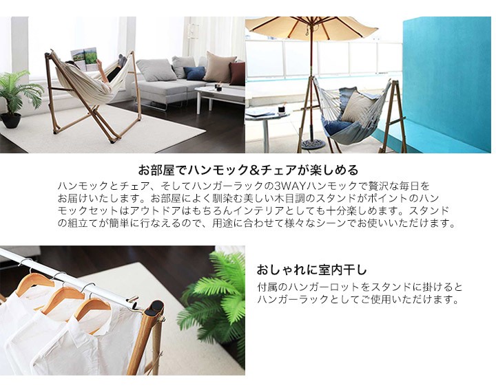 ・ハンモックには絶対に足から乗らないでください。まずハンモックにまたがり、ゆっくりと腰から上半身にかけて横たわり、最後に足を乗せてください。降りる際はゆっくりと足から降りてください。