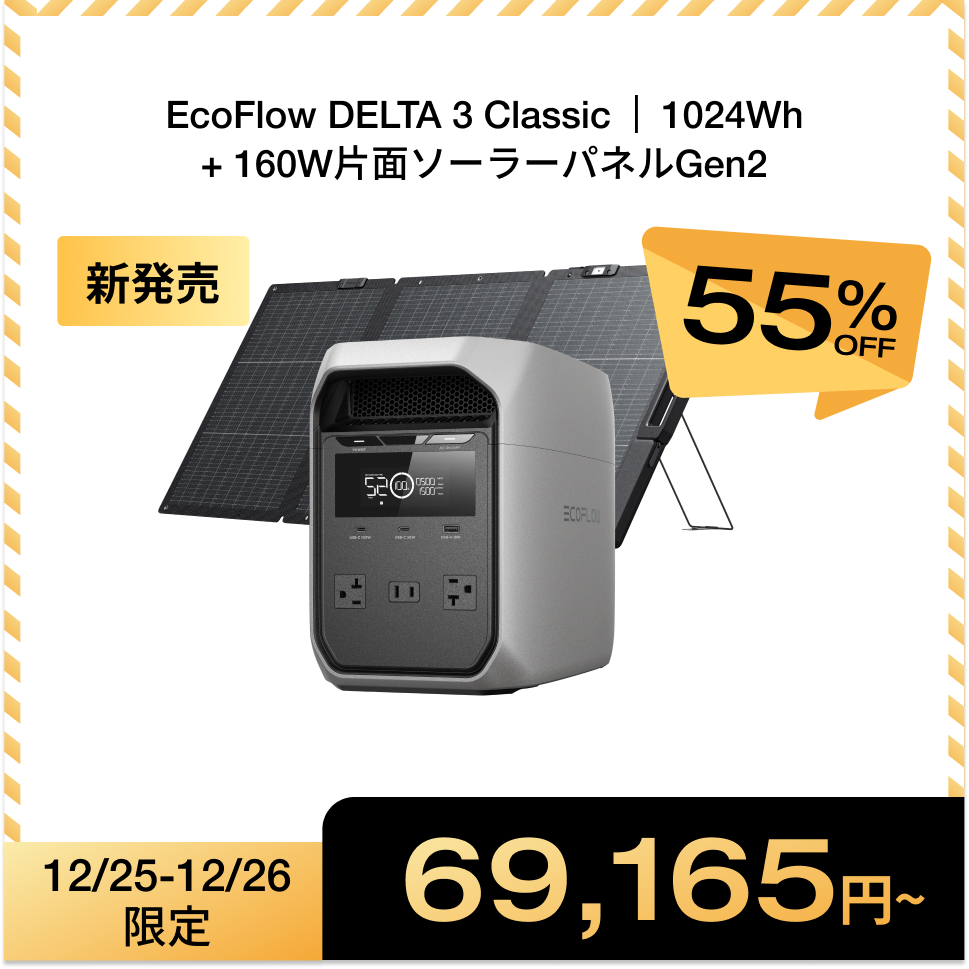 新製品 EcoFlow DELTA 3 Classic ポータブル電源 1024Wh ソーラーパネル 160W両面 1枚 2点セット 大容量 10年長寿命 キャンプ 防災 停電対策 車中泊 エコフロー