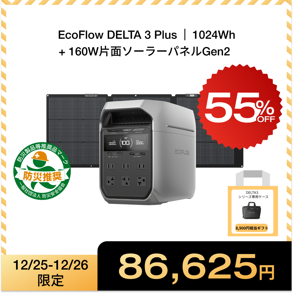 防災グッズ ポータブル電源 ソーラーパネル セット 大容量 EcoFlow DELTA 3 Plus 1024Wh + 160W 太陽光発電 太陽光パネル 車中泊 家庭用 蓄電池 停電 エコフロー