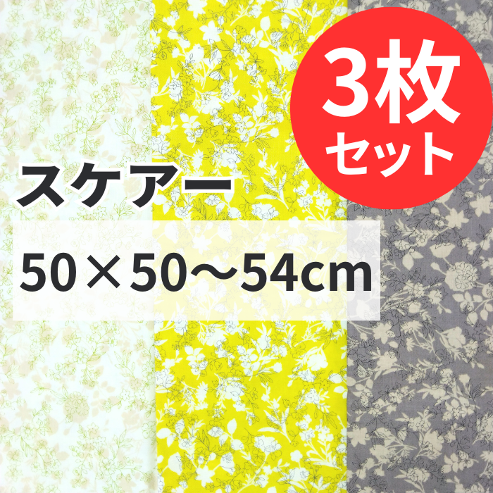 花柄ハギレスケアー 3枚セット 50cm×50~54cm カットクロス 布 プリント生地 はぎれ 花 手芸用 布セット ハンドメイド