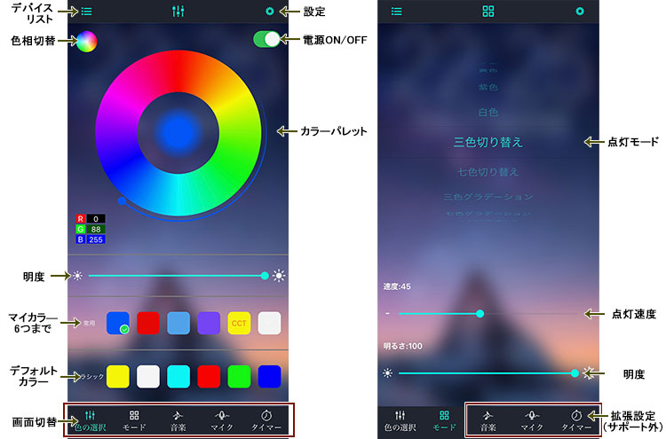 ■専用のスマホアプリから、調色・調光・点滅・フェードなど多数のモード切替ができます。