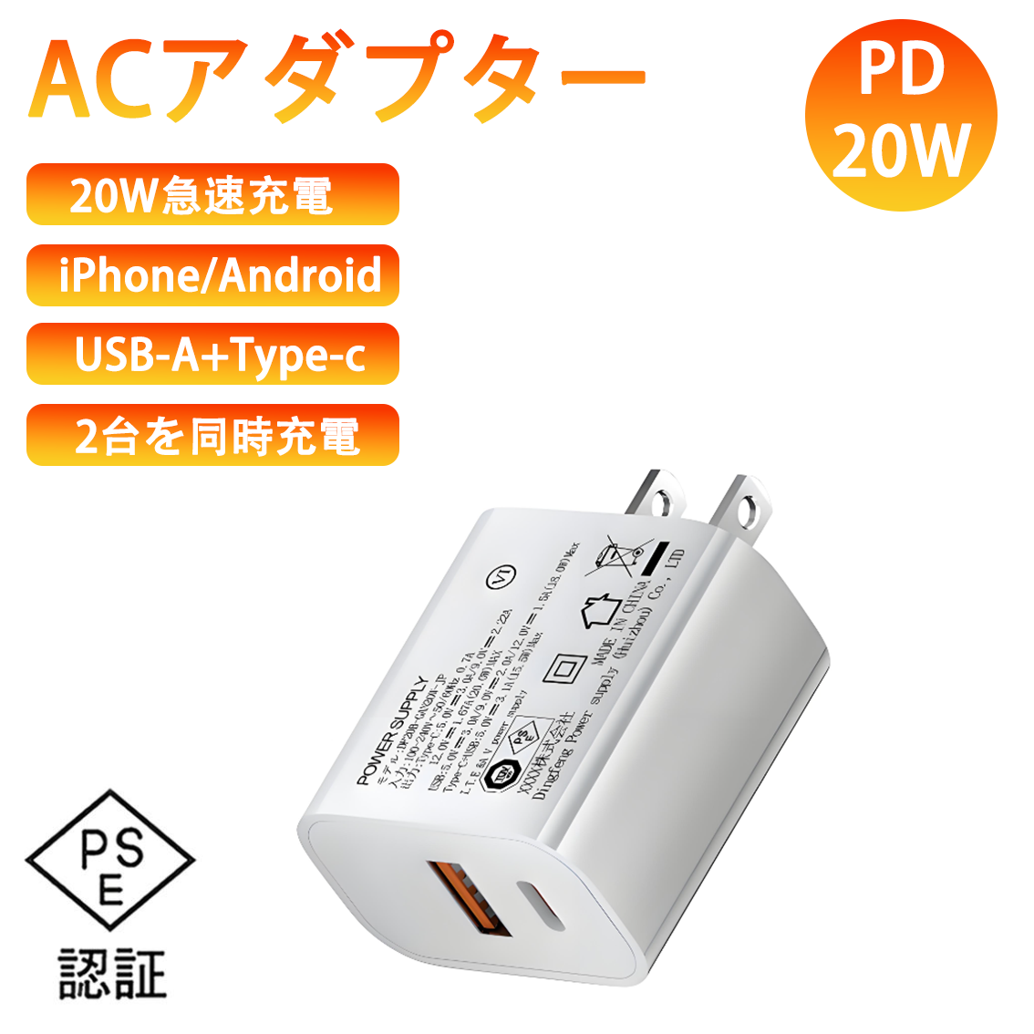 ACアダプター USB充電器 iPhone充電 PD20W 急速充電対応 スマホ充電 USB-A & Type-C 電源アダプター 2ポート搭載 AC100〜240V対応 ACアダプター GAN20W