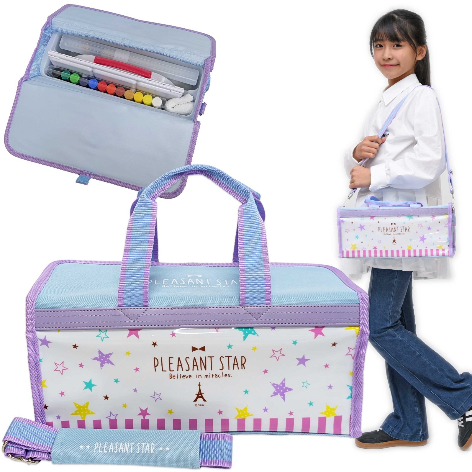 持ち手とショルダーベルトはパープル×水色のストライプ、