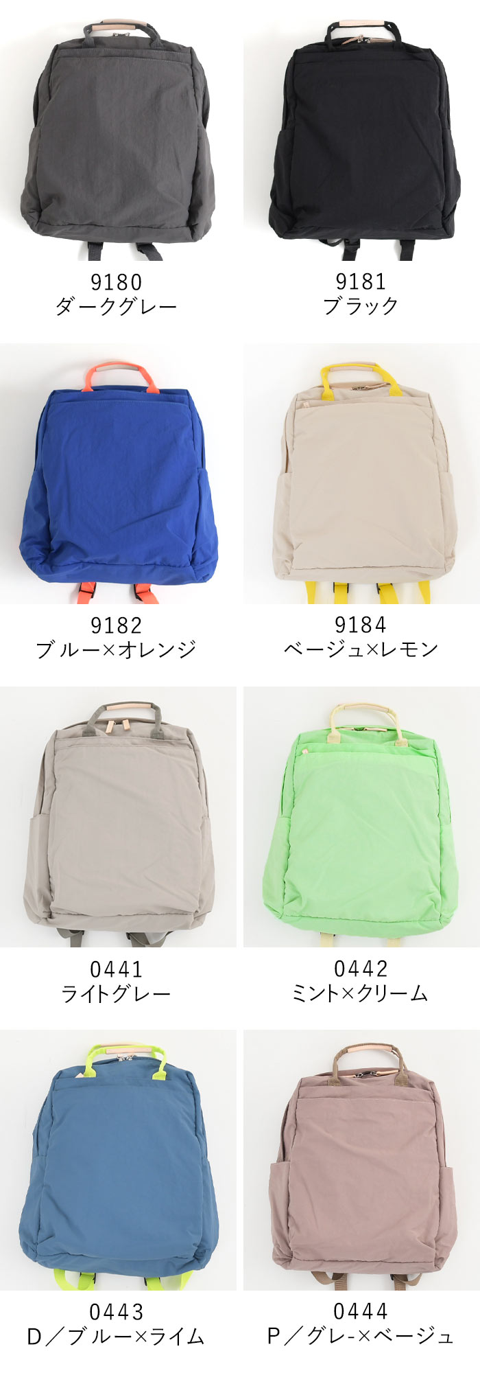 | カラー | 9179:サンドベージュ 9180:ダークグレー 9181:ブラック 9182:ブルー×オレンジ 9515:サンドカーキ 9184:ベージュ×レモン 0441:ライトグレー 0442:ミント×クリーム 0443:D/ブルー×ライム 0444:P/グレ-×ベージュ |
