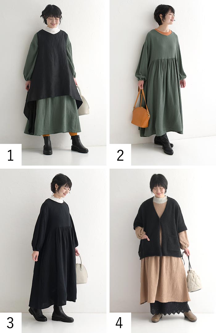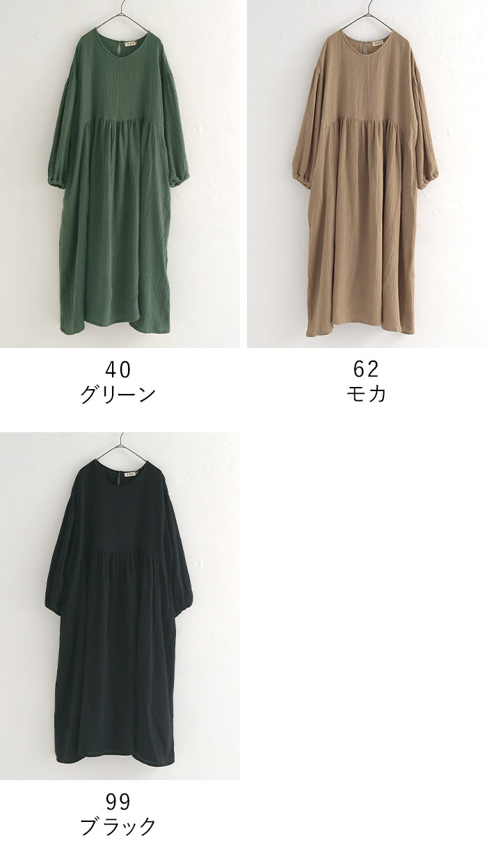 M〜3L D*g*y ワンピースコットンダブルガーゼ ギャザー ふんわり 綿100%/ カジュアル ナチュラル シンプル 体型カバー ゆったり Aライン フレア ロング 長袖 dgy エコロコ sel, Ms, Ls, LL, 3L, 30代 40代 50代/ 秋冬 大きいサイズ グリーン 緑 モカ ブラウン 茶色 ブラック 黒