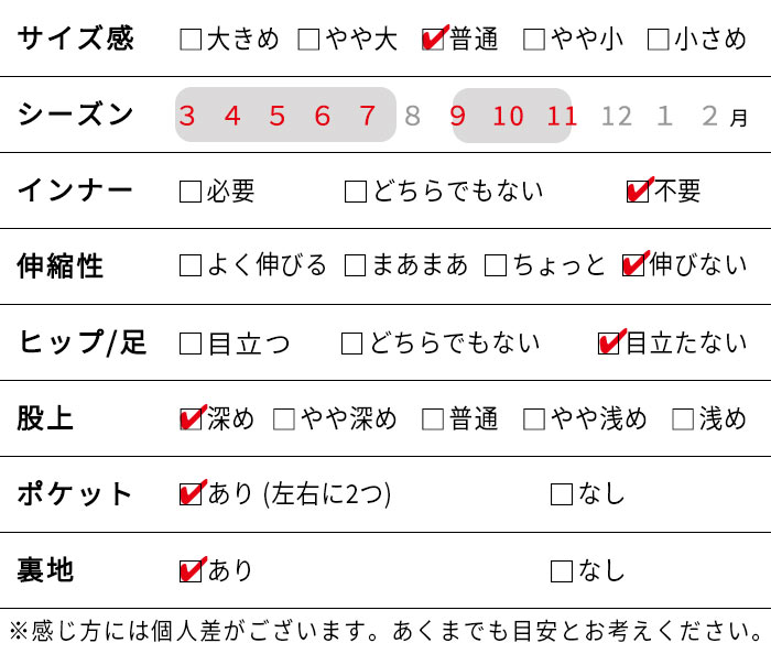 ※ウエストは「自然に置いた状態(最小)〜伸ばした状態(最大)」の寸法です。