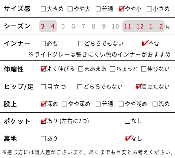| カラー | 17:ライトグレー | 少しベージュが混ざったライトグレー 39:モカ | やや黄みのあるモカベージュ 24:ブルーグレー | グレーにブルーを混ぜたくすみカラー 21:ブラック | ソリッドなブラック 19:チャコール | 赤みの強いチャコール 66:ルビーレッド | 少し黄みを含んだルビーレッド |