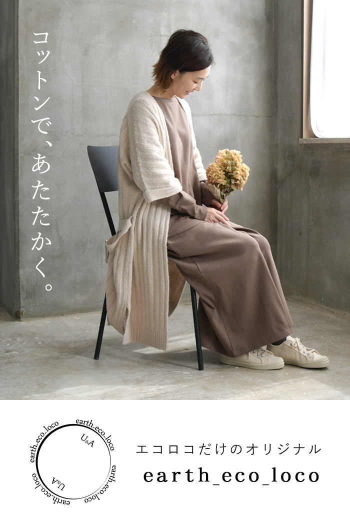 ecolocoのオリジナル earth_eco_loco 「長い間着られる」「着心地がいい」「着回しができる」がキーワード。天然素材を中心に、6つのシリーズで展開しています。 | ||