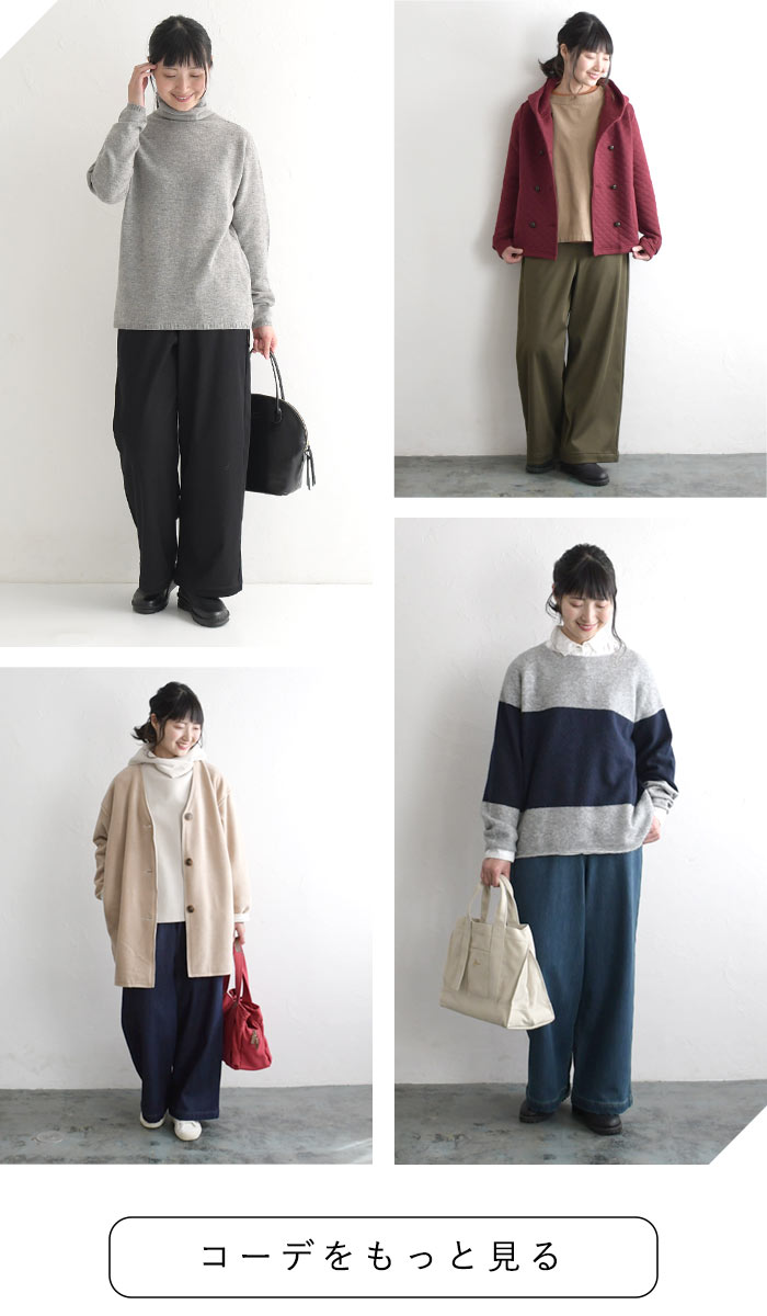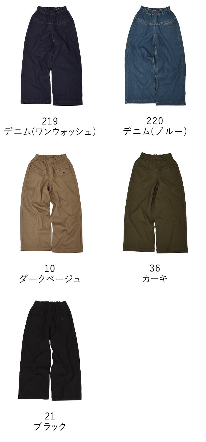 | カラー | 219:デニム(ワンウォッシュ) | わずかに赤みのある暗めなネイビーに近い色味 220:デニム(ブルー) | わずかに黄みのある少し褪せたブルー 10:ダークベージュ | 少し暗めの落ち着いたベージュ 36:カーキ | わずかに黄みのある暗いトーンのカーキ 21:ブラック | ノーマルなブラック |