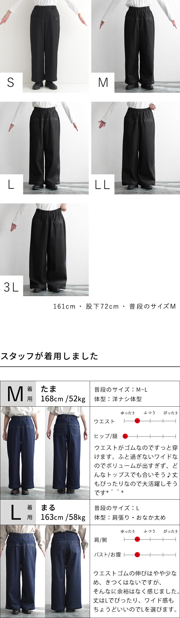 ※ウエストは「自然に置いた状態(最小)〜伸ばした状態(最大)」の寸法です。