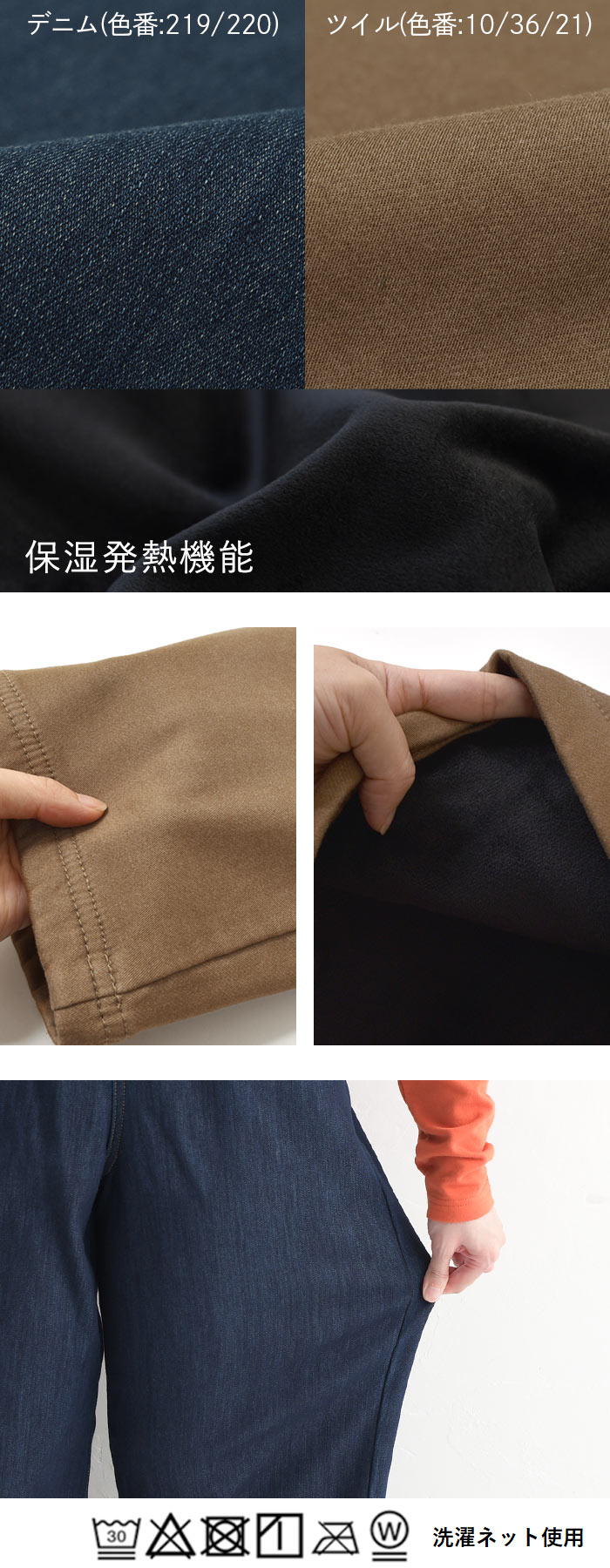 | 素材 | 【表面】デニム:219/220:コットン75%/ポリエステル23%/ポリウレタン2% ツイル:10/36/21:コットン60%/ポリエステル33%/レーヨン5%/ポリウレタン2% 【裏面(共通)】ベロア:ポリエステル95%/ポリウレタン5% |