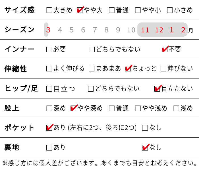 | 素材 | 表側:コットン70%、ポリエステル25%、ポリウレタン5% 裏側:ポリエステル94%、ポリウレタン6% |