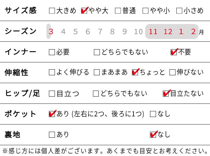 | 素材 | 表側:コットン70%、ポリエステル25%、ポリウレタン5% 裏側:ポリエステル94%、ポリウレタン6% |