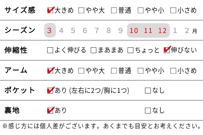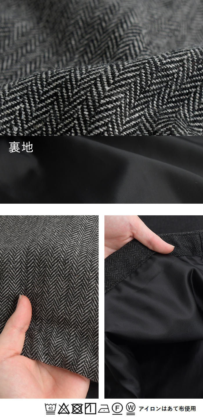 | 素材 | 表地:ポリエステル72%/レーヨン19%/アクリル9% 裏地:ポリエステル100% |