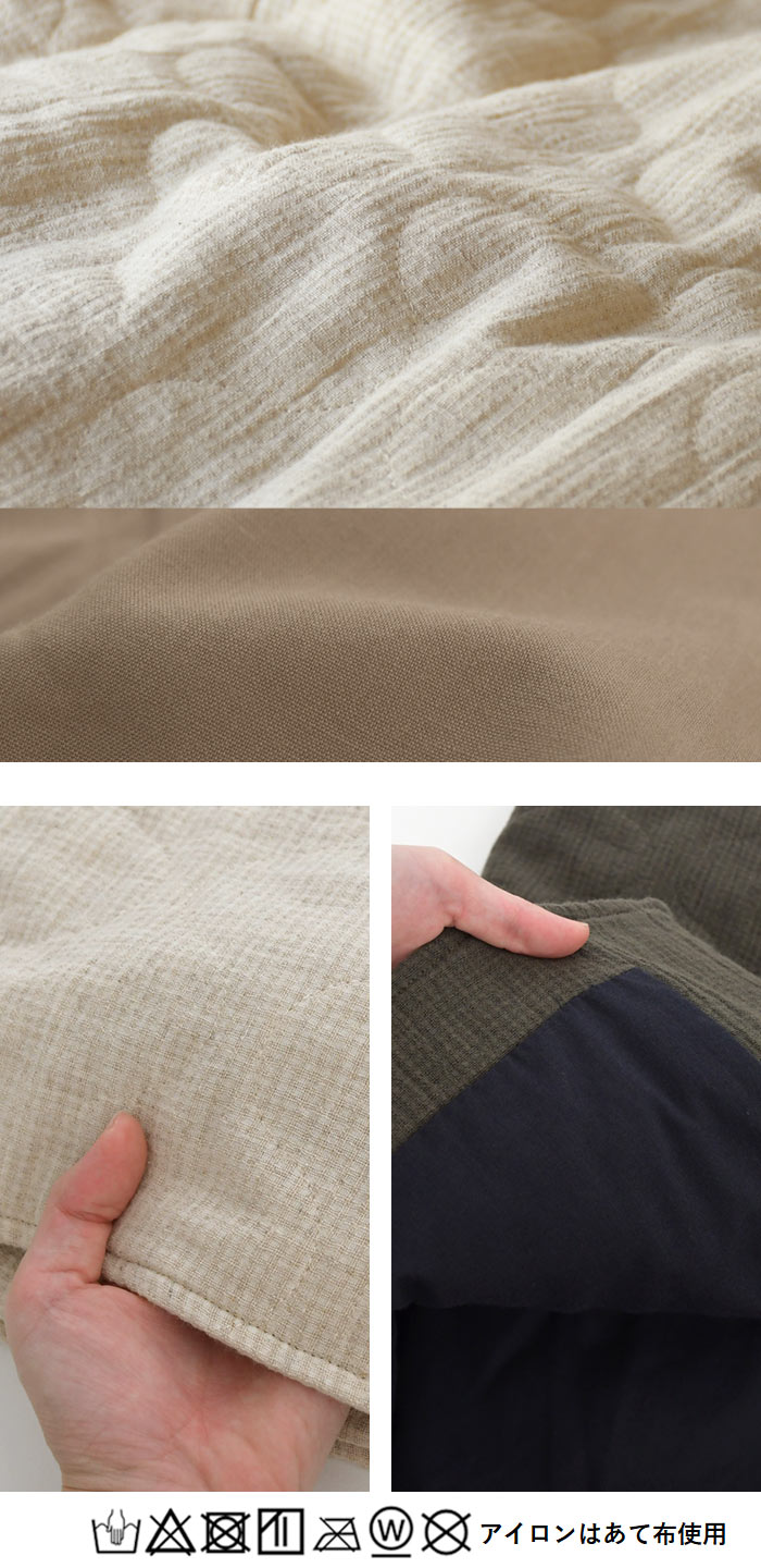 | 素材 | 表地:麻55%/綿45% 中綿:ポリエステル100% 裏地:ポリエステル80%/綿20% 別布:ポリエステル100% |