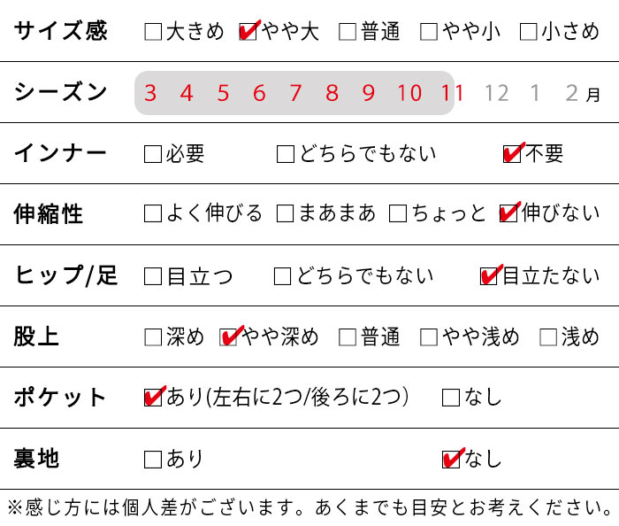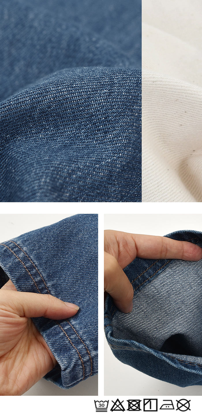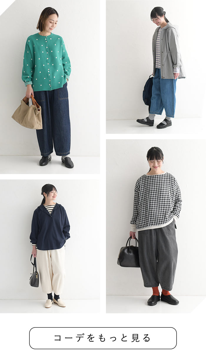 | カラー | 52:ブルー | やや褪せ感のある、薄すぎないブルー 61:インディゴ | 暗いトーンのネイビー 21:ブラック | 色落ち感のある、グレーに近いブラック 03:生成り | 綿カス残しの、クリームがかった白 |