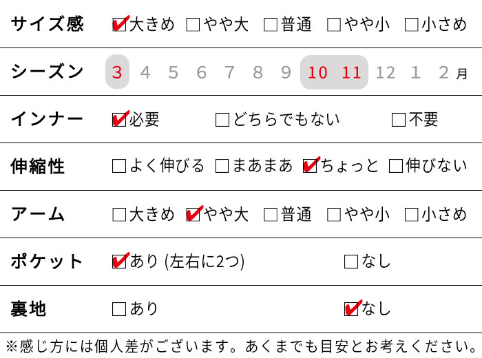 | ご注意 | 洗濯時や着用時の摩擦、汗などで色移りの可能性がございます。 |