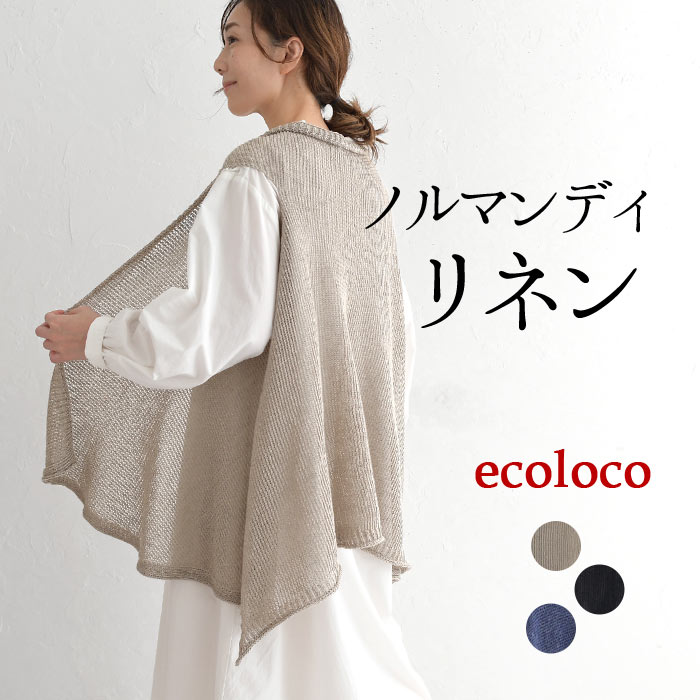 ジレ ベスト レディース ニット ノルマンディリネン ピン付き 日本製 麻100%/ 着後レビューでクーポン☆ カジュアル ナチュラル 体型カバー ゆったり 羽織り フレア トップス おしゃれ 大人可愛い エコロコ e+, Ms, Ls, LL, 3L,/ 春夏 大きいサイズ 30代 40代 50代 ナチュラル ブラウン 茶色 ベージュ ブラック 黒 ブルー 青 ネイビー 紺