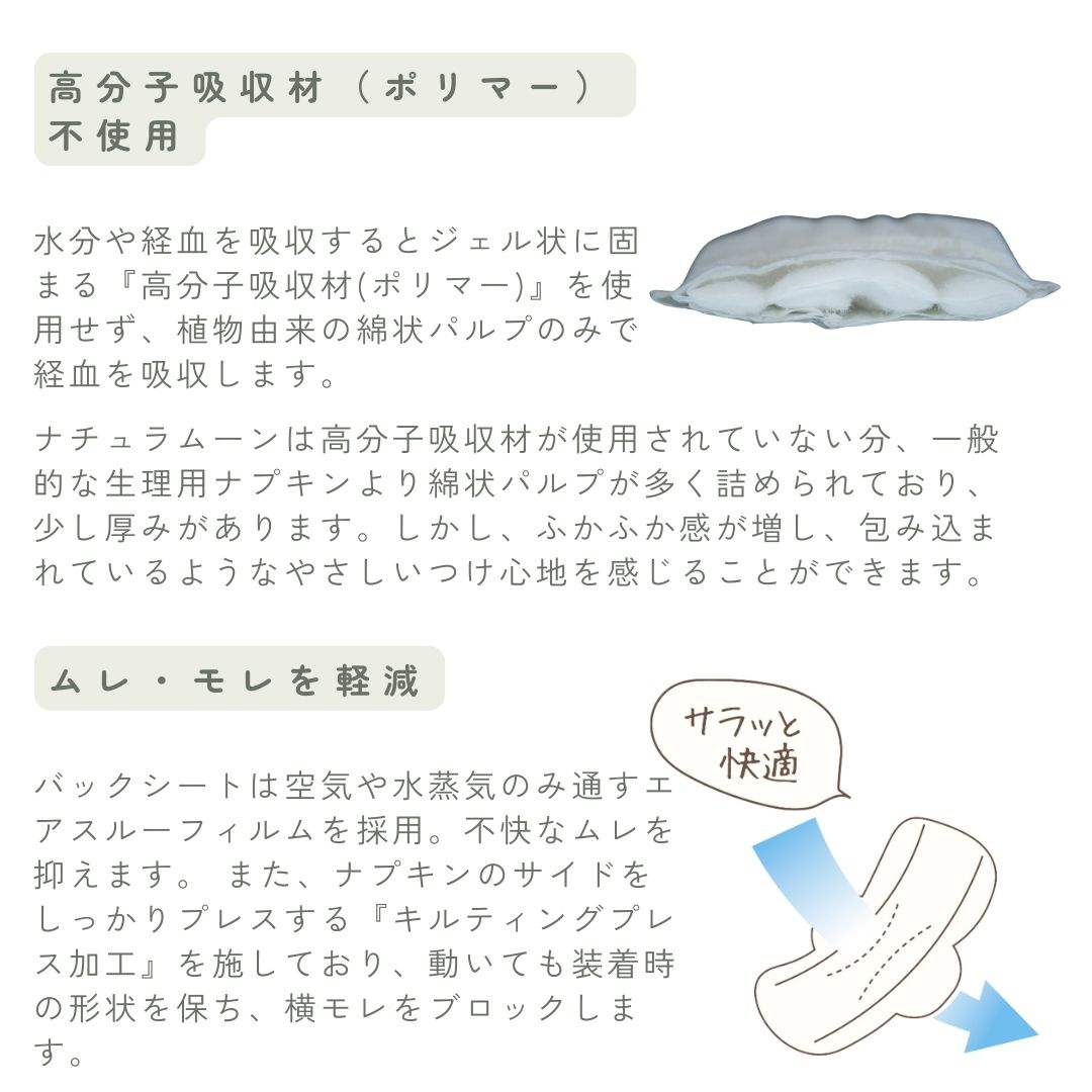| 特徴 | ●トップシートはコットン不織布100%!女性のデリケートな肌に触れるトップシートには、肌に優しいコットンだけでできた不織布を使用。 ●高分子吸収材不使用!水分を吸収してジェルに状固める高分子吸収材不使用。冷たいジェルで女性を下から冷やしません。 ●ムレにくいエアースルーフィルム採用! ムレを防いで肌ストレスを軽減します。 ●酸素漂白!医薬部外品である生理用ナプキンは、トップシートが漂白されている必要があります。ナチュラムーンシリーズのナプキンは、人体や環境への負荷が少ないといわれている酸素漂白を採用しています。 ●無香料・無着色・酸化グラフェン不使用 |