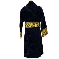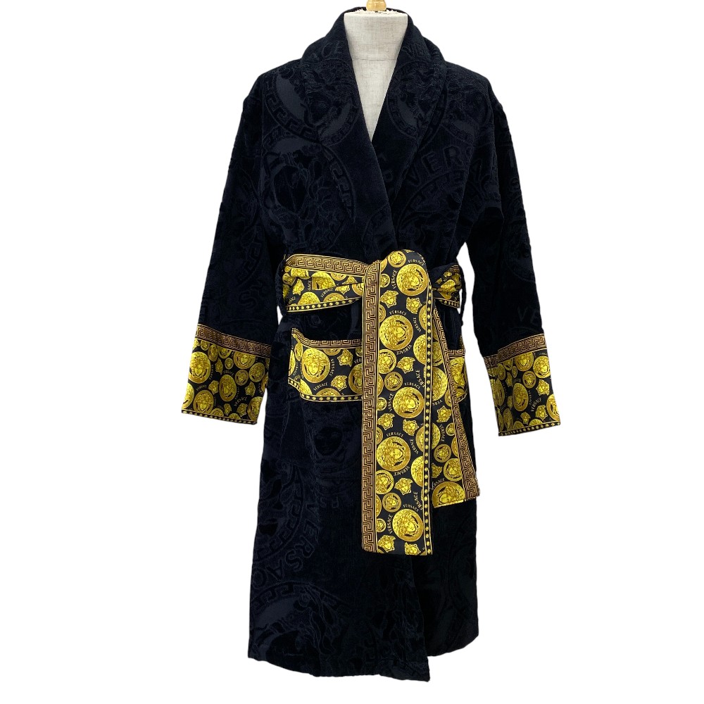 未使用 ヴェルサーチェ メデューサ バスローブ ガウン ロゴ 総柄 ジャガード ベルト コットン ブラック×ゴールド Versace [サイズM]
