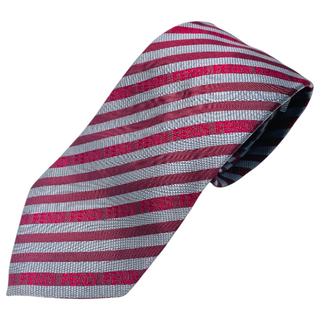 FENDI フェンディ ネクタイ ループタイ アクセサリー 小物 ストライプ 総柄 シルク ロゴ グレー レッド